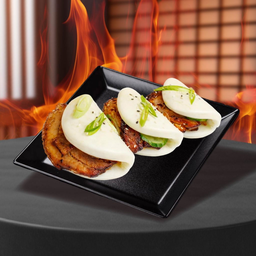 Soft, pillowy bao buns stuffed with tender, slow-braised pork belly, topped with a drizzle of savory-sweet sauce. A perfect balance of melt-in-your-mouth richness.