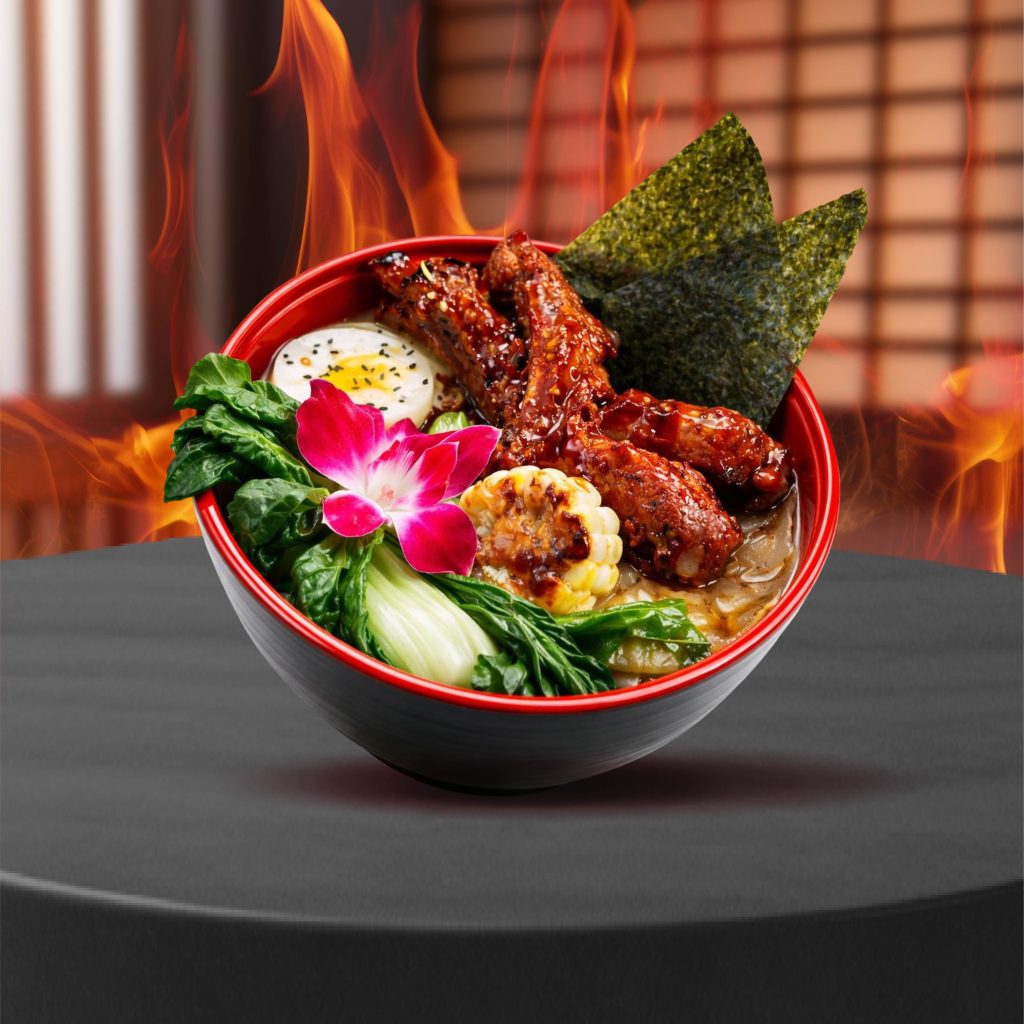 A hearty bowl of ramen topped with tender, smoky rib tips, slow-cooked to perfection, layered over rich broth and springy noodles. Bold, savory comfort in every bite.